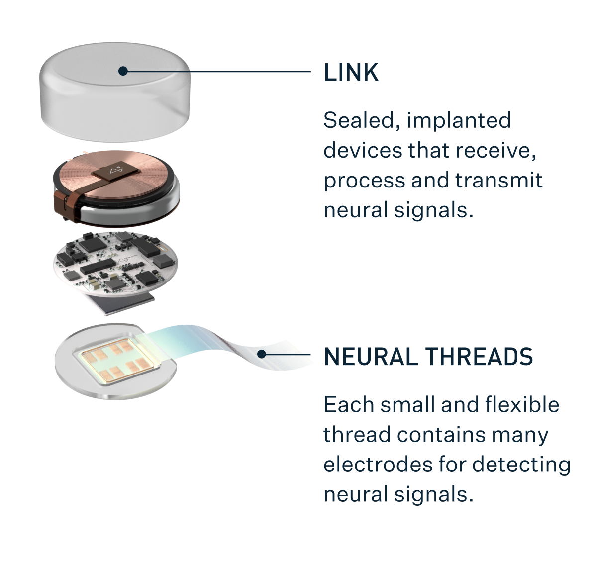 شريحة BCI مزروعة في الدماغ تحتوي على 1024 قطبًا كهربائيًا، متصلة بخيوط رفيعة جدًا تراقب نشاط الخلايا العصبية بدقة فائقة.